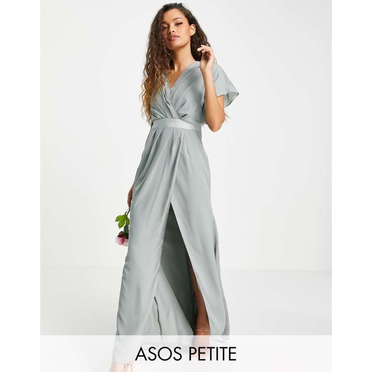 ASOS DESIGN Petite Bridesmaid short sleeved cowl front maxi dress with button back detail in olive