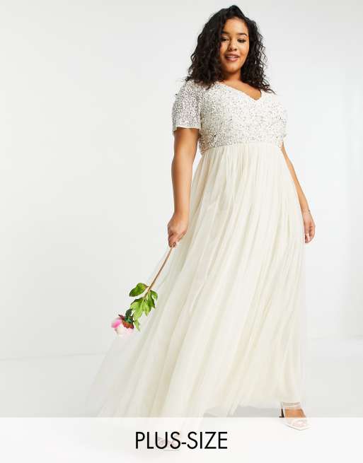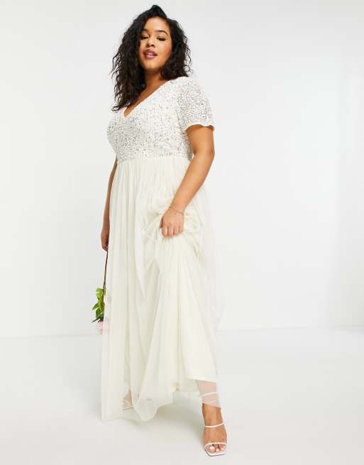 Maya Plus Bridesmaid v neck maxi tulle dress with tonal delicate sequins