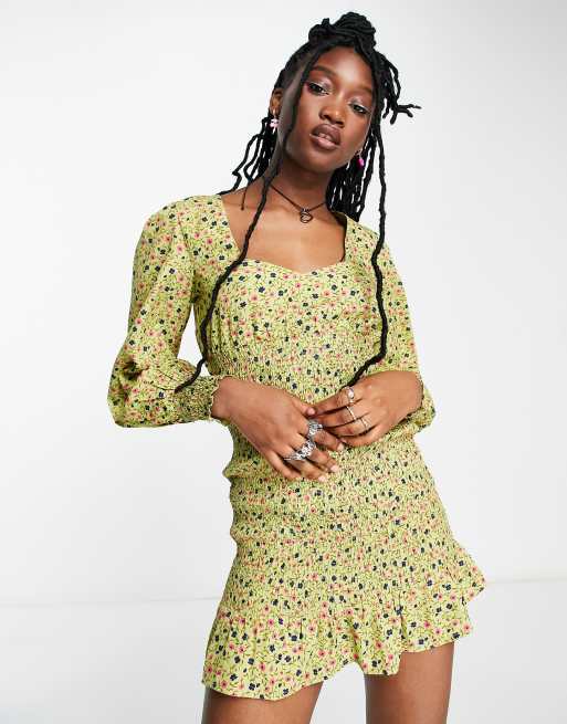 Daisy Street square neck shirred mini dress in khaki ditsy