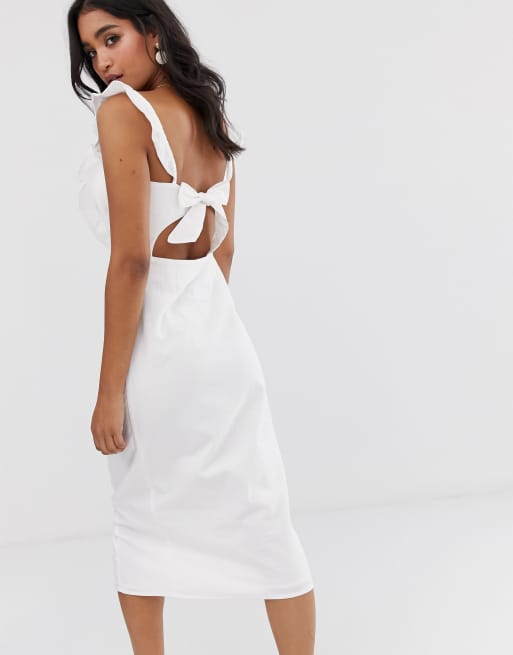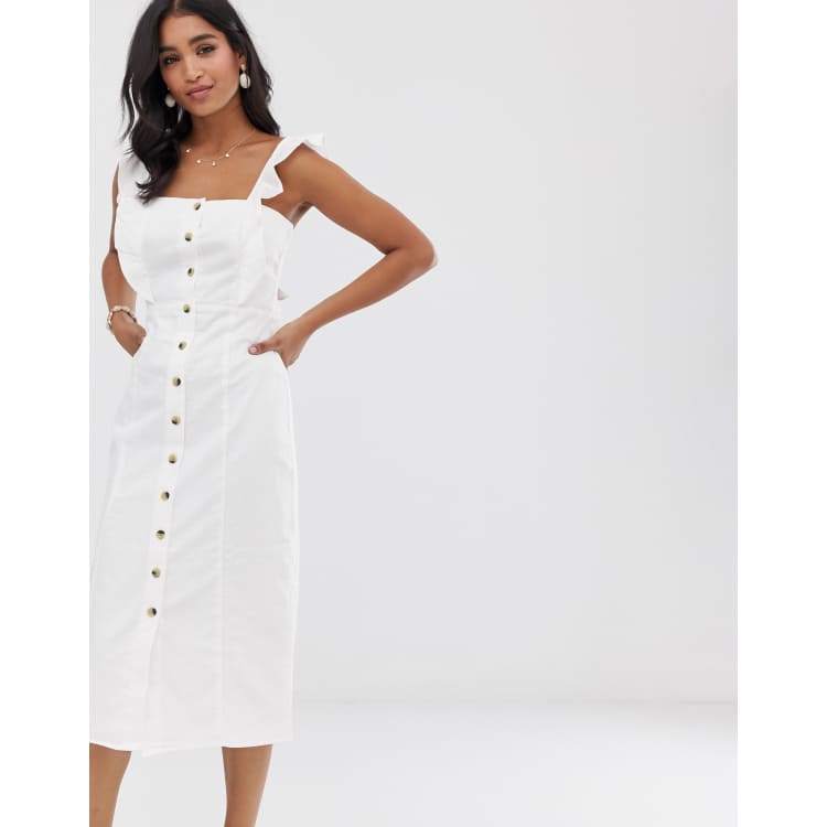 Warehouse button front midi dress with frill detail in white