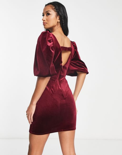 River Island Petite velvet plunge mini dress with puff sleeves in