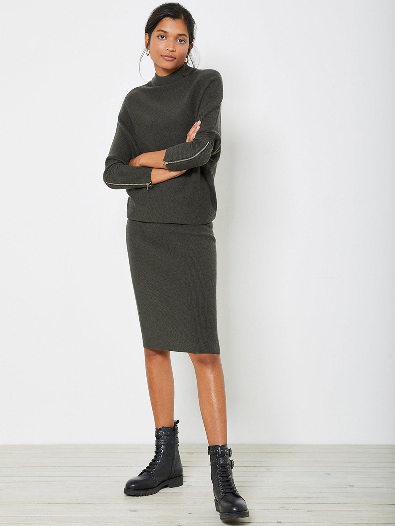Mint velvet knitted clearance dress, Mint Velvet Funnel Neck Zip Sleeve Knit Dress Khaki Compare clearance