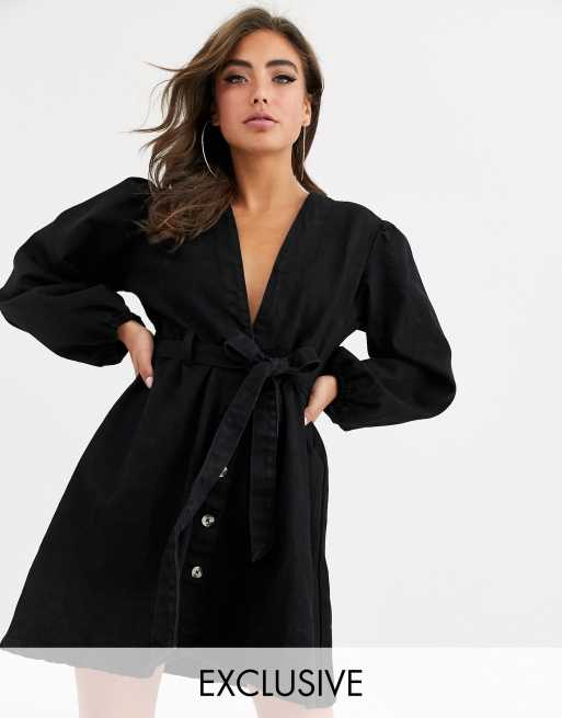 Boohoo exclusive denim v neck dress with puff sleeve in black ASOS