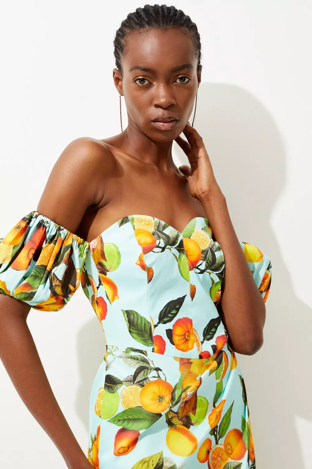 Lemon print dress clearance forever 21, Italian Signature Citrus Print Bardot Mini Dress Karen Millen clearance