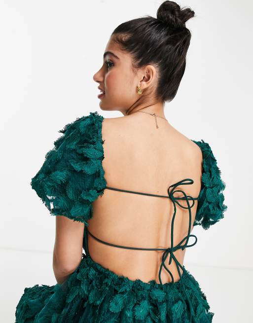 Love Triangle mini baby doll dress with backless ties in emerald 3D lace