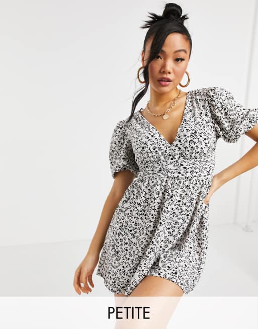 Miss Selfridge Petite v neck fit flare dress in black and white ditsy