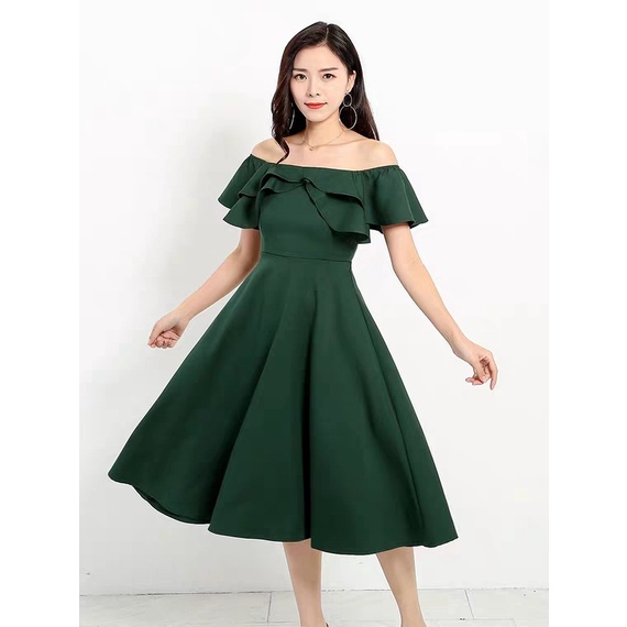 Off shoulder flare clearance dress, READY STOCK Premium Aurora Green Offshoulder Flare Midi clearance