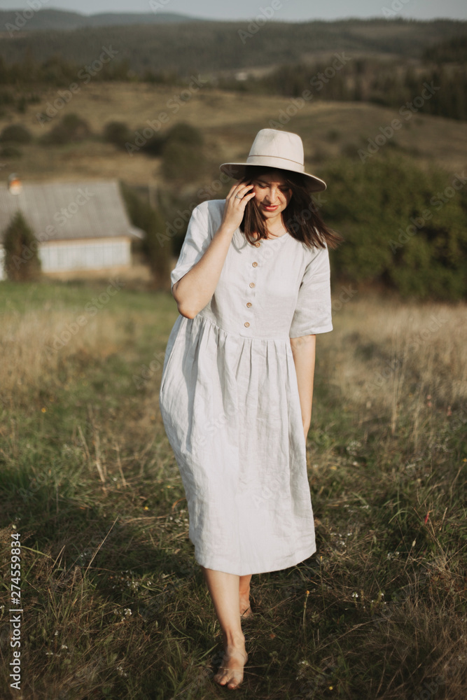 Sunny girl linen clearance dress, Stylish girl in linen dress and hat walking barefoot in grass in clearance