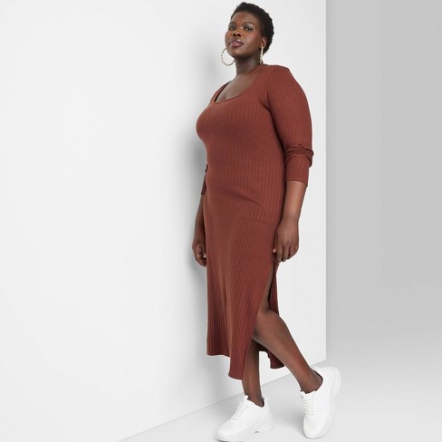 Women s Long Sleeve Rib Knit Midi Dress Wild Fable Dark Brown