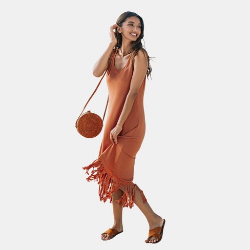 Women s Burnt Orange Sleeveless Fringe Midi Dress Cupshe S Orange