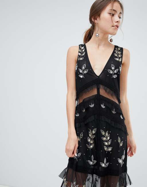 Miss selfridge tiered maxi dress clearance with lace detail in black, Miss Selfridge Petite strappy lace back maxi slip dress in mono clearance