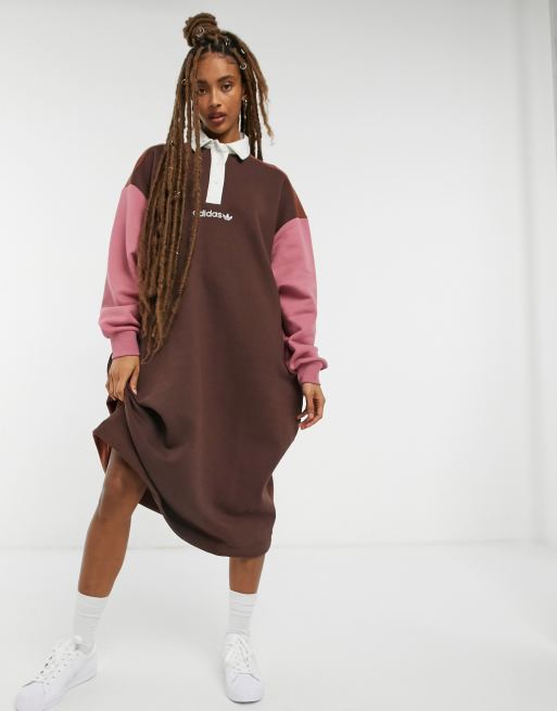 adidas Originals Cosy Comfort fleece oversized polo dress in colour block brown