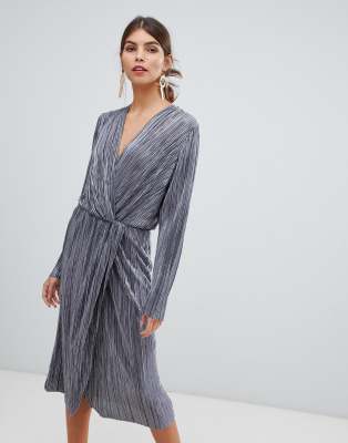 Vila pleated metallic knot midi dress in silver