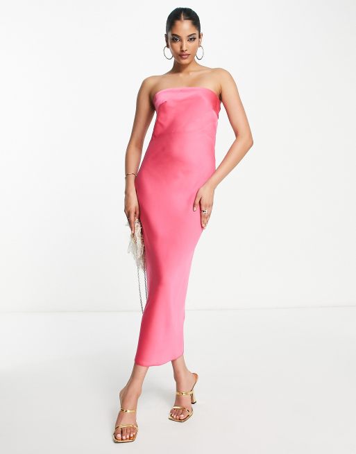ASOS DESIGN satin bandeau midi dress with cowl back in hot pink