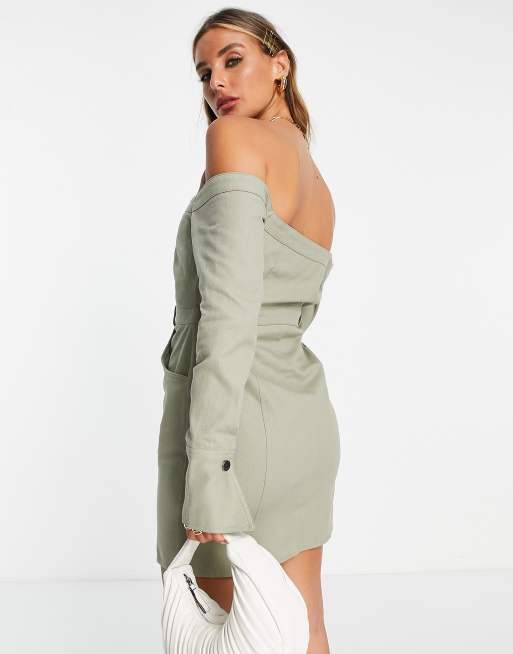 ASOS DESIGN off shoulder twill mini dress in khaki ASOS