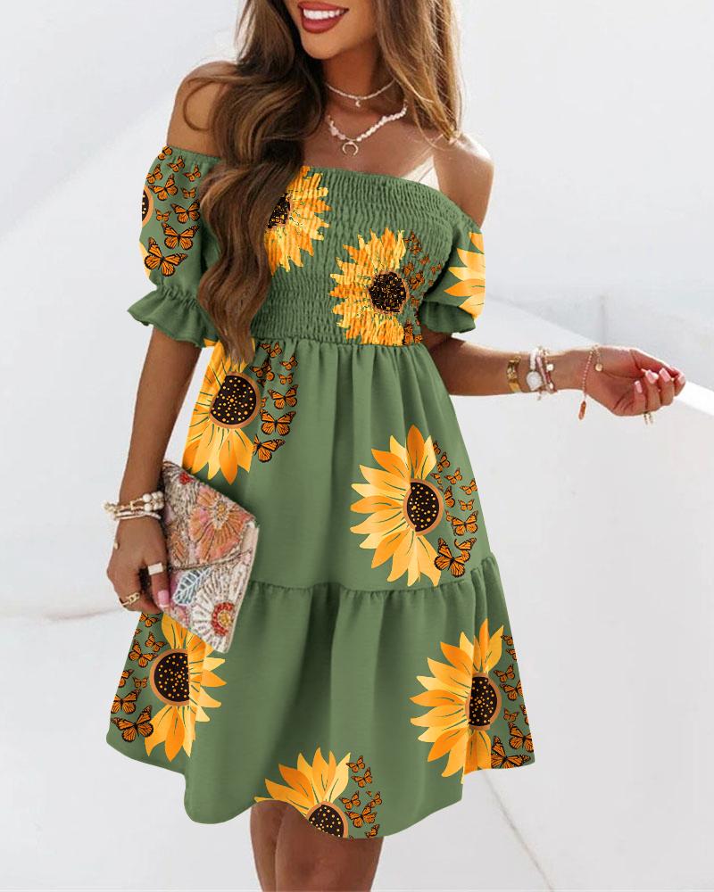 25 Discount Sunflower Butterfly Print Off Shoulder Swing Dress
