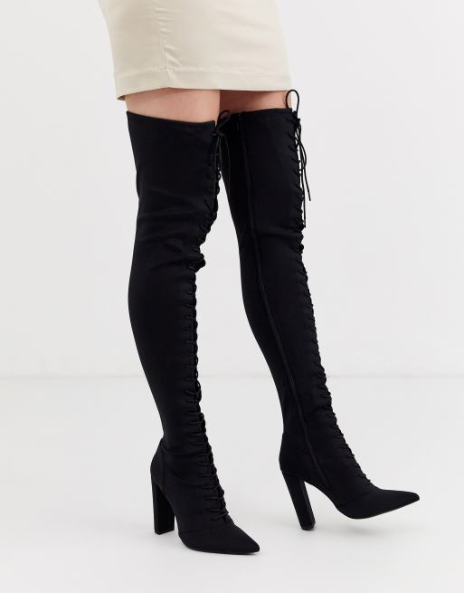 ASOS DESIGN Knowledge lace up thigh high boots in black