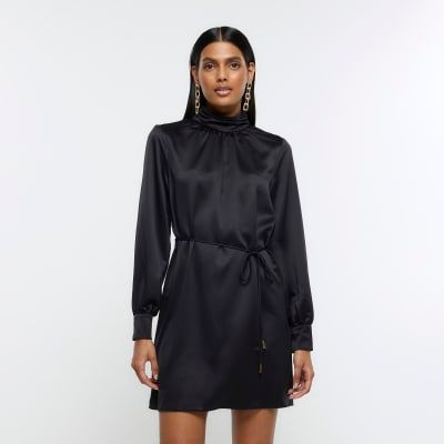 River Island Womens Black Satin Tie Waist Shift Mini Dress