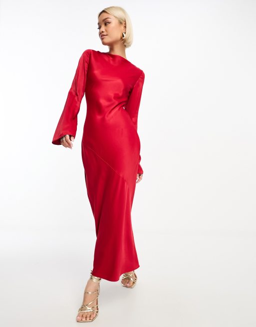 Red satin lace clearance up dress, Red satin v neck full dress with slit and lace up back sales clearance