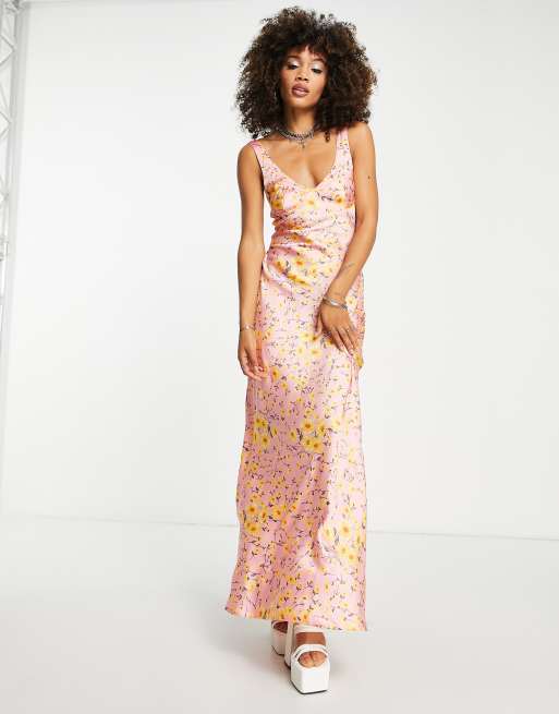 ASOS DESIGN Asymmetrisches Maxi Tr gerkleid aus Satin mit gelbem Blumenmuster