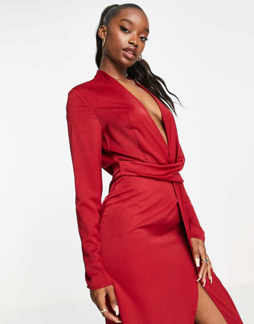 True Romance Red Satin Plunge Neck Midi Dress With Belt Detail