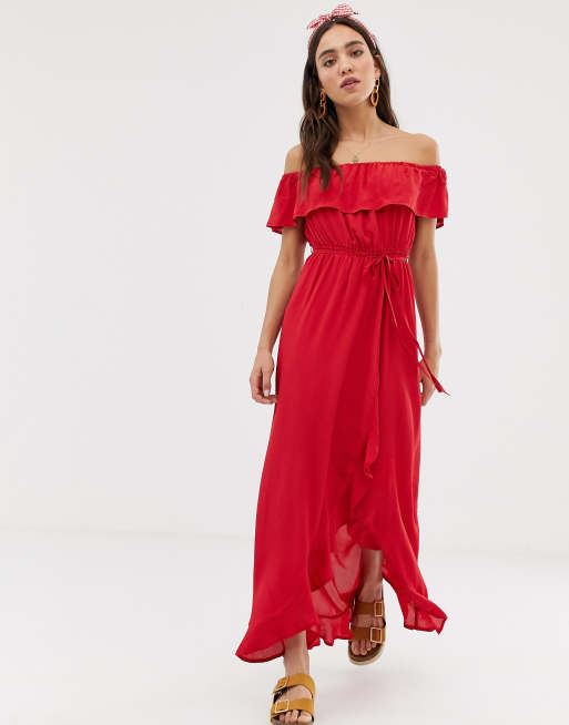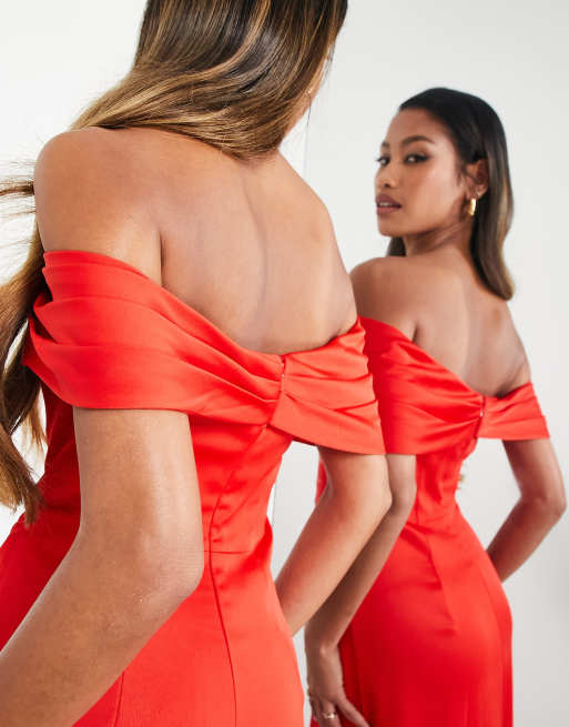 River island red clearance bardot dress, ASOS DESIGN Bridesmaid satin bardot drape wrap maxi dress in red clearance