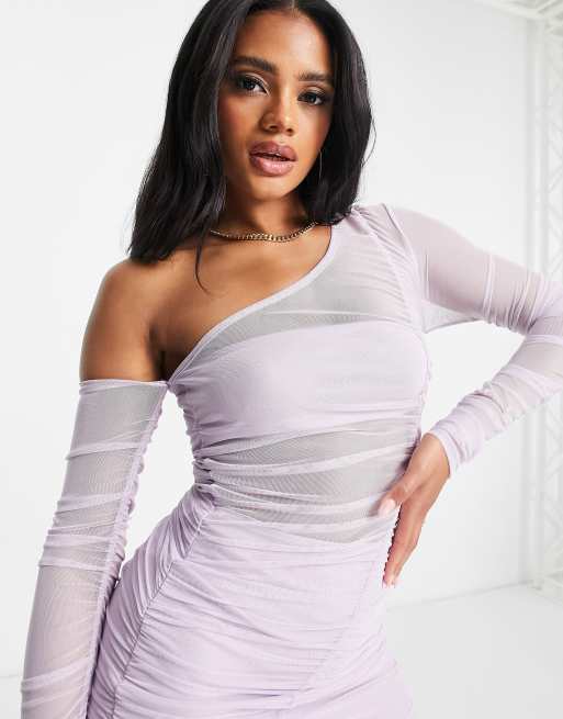 Mesh one shoulder clearance dress, ASYOU mesh ruched one shoulder dress in lilac clearance