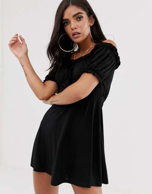 Black bardot swing clearance dress, Black White Polka Dot Bardot Neckline Puff Sleeve 50s Swing Dress clearance