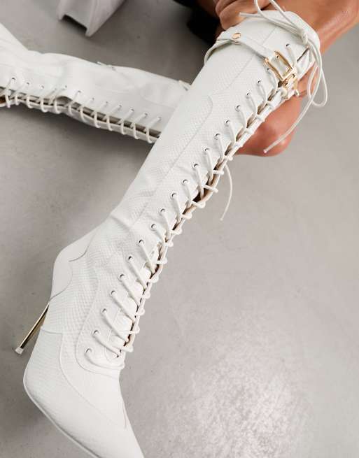 White lace up clearance thigh high boots, White Sexy High Heel Lace Up Knee High Boots clearance