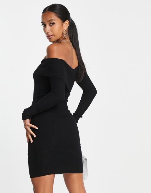 Black Rib Bardot Sleeve Bodyon Dress PrettyLittleThing