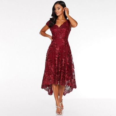 Quiz Petite Wine Lace Embroidered Bardot Dip Hem Dress 10