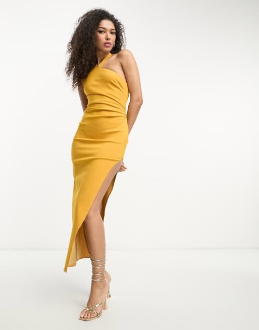 Total Upgrade Mustard Yellow Ruched One Shoulder Midi Dress