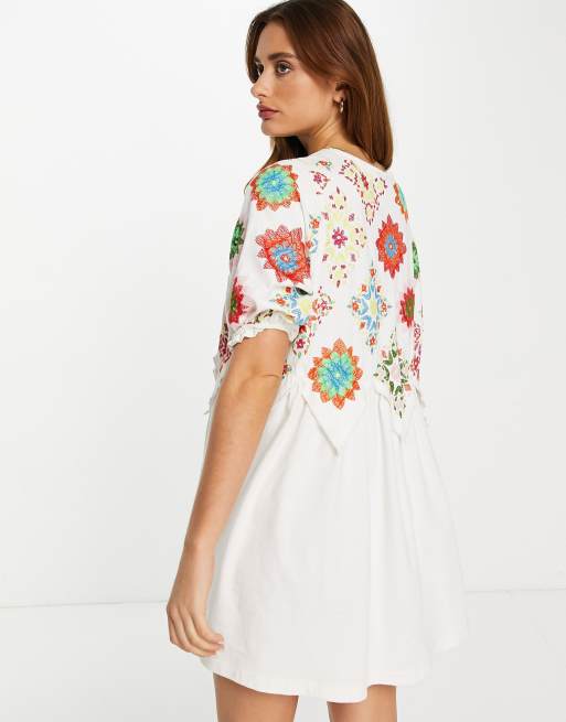 ASOS DESIGN mini crochet embroidered smock dress with puff sleeves in cream