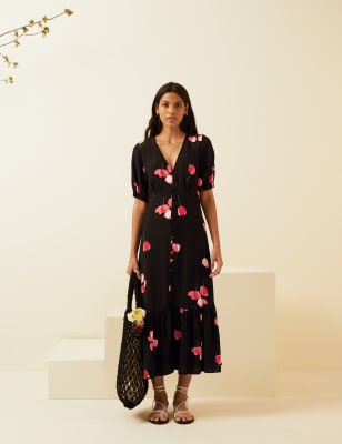 Floral V Neck Button Through Midi Tea Dress M S X GHOST M S