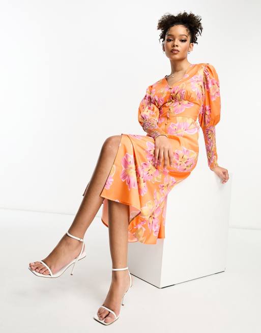 In The Style button through shirred cuff detail midi tea dress in orange floral print