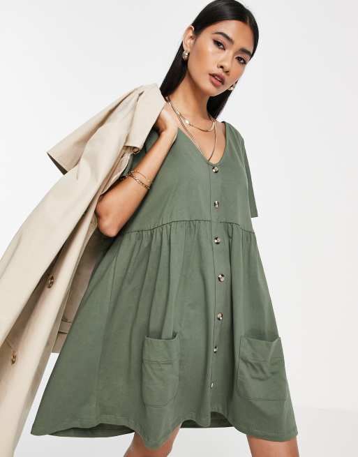 ASOS DESIGN button through mini smock dress with pockets in khaki