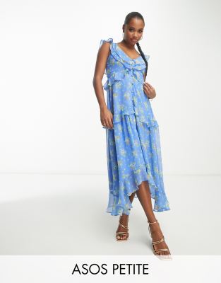 Floral ruffle tea clearance dress, ASOS DESIGN Petite chiffon v neck frill midi tea dress with button clearance