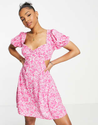 Miss Selfridge tie back mini tea dress in pink tropical floral