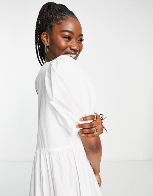 JDY puff sleeve tiered midi smock dress in white