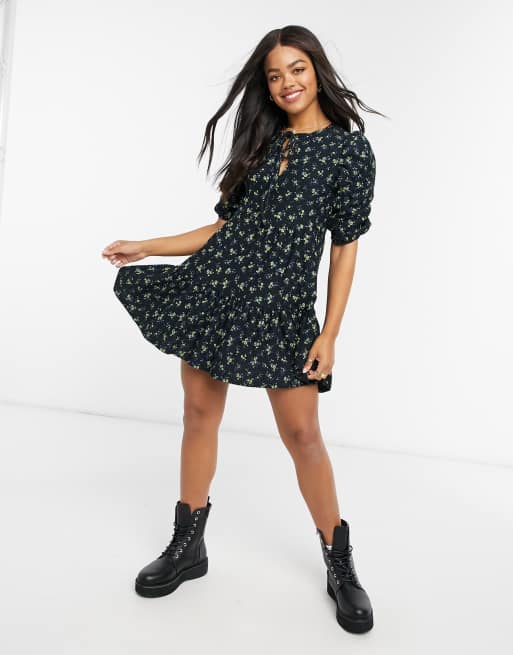 ASOS DESIGN textured mini tiered smock dress in black floral