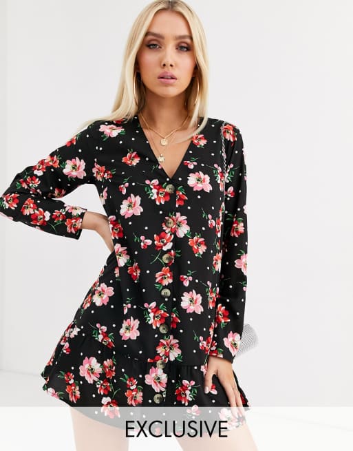Boohoo exclusive button through smock dress in black floral and polka dot