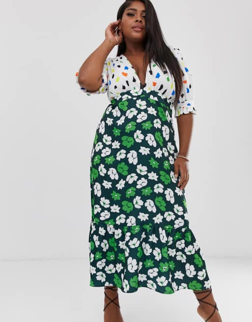 ASOS DESIGN Curve plunge tea maxi dress with pep hem in mixed print