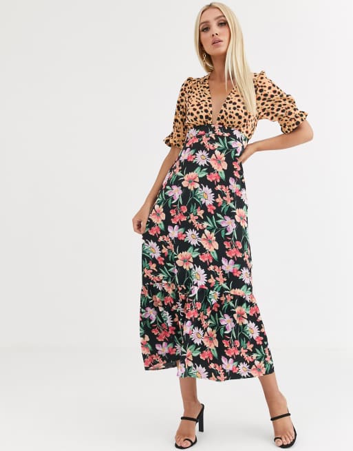 Asos design plunge tea maxi dress clearance with pep hem in mixed print