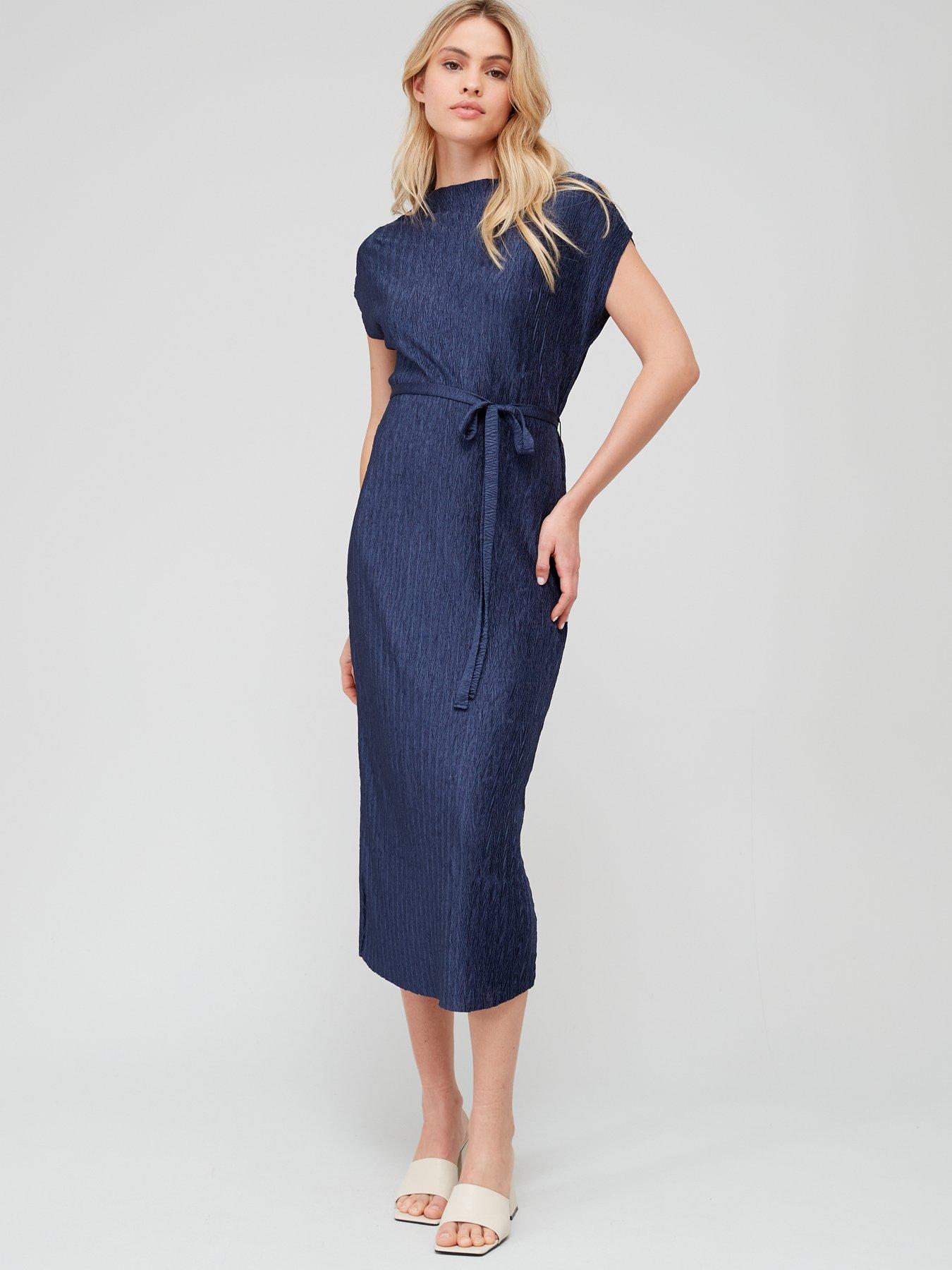 V by Very Plisse Tie Waist Midi Dress Navy Very Ireland