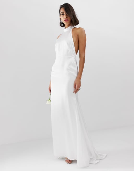 Headed Towards Romance White Satin Backless Halter Maxi Dress