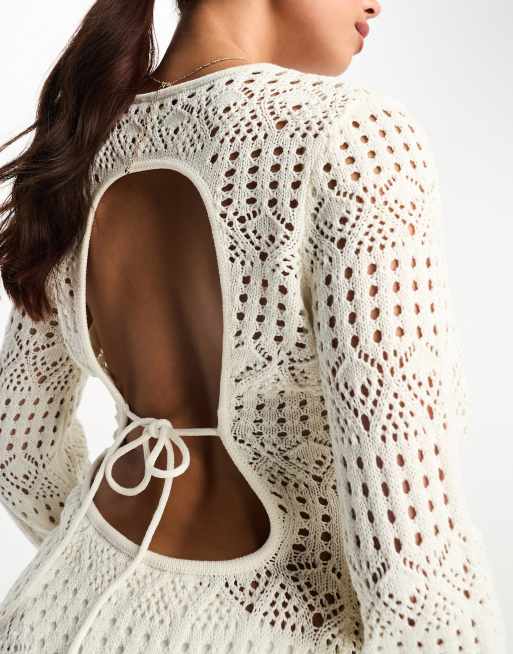 Miss Selfridge long sleeve open back crochet dress in cream ASOS