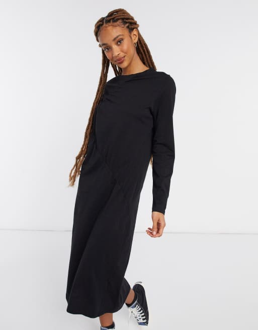 Monki Charla cotton long sleeve ruched front midi dress in black BLACK