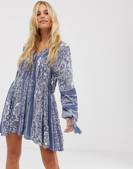 En Creme swing dress with drop waist and volume sleeves in paisley print