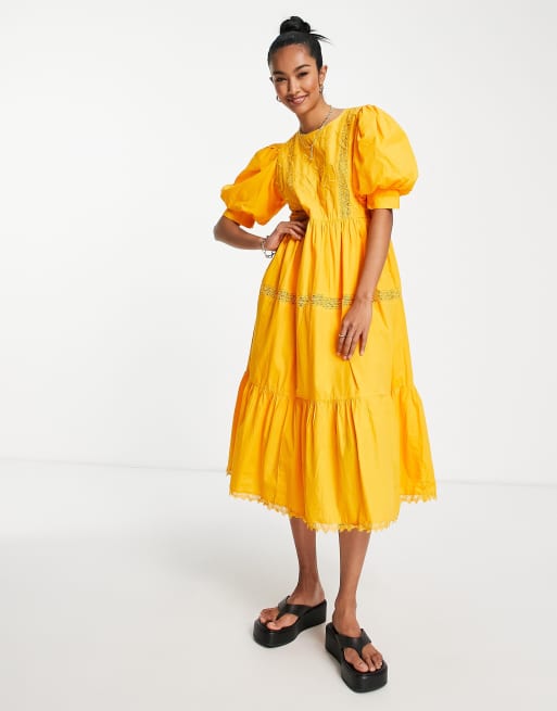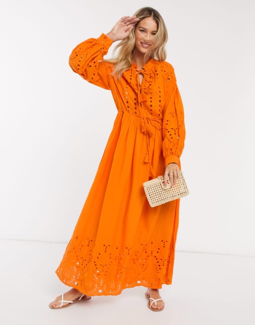 Yas clearance orange dress, Y.A.S cotton tiered embroidered midi dress in orange ORANGE clearance