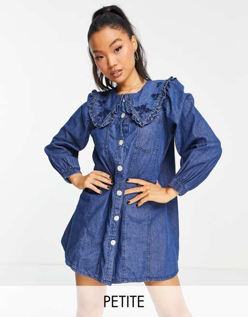 River Island Petite frill collar puff sleeved denim mini shirt dress in black